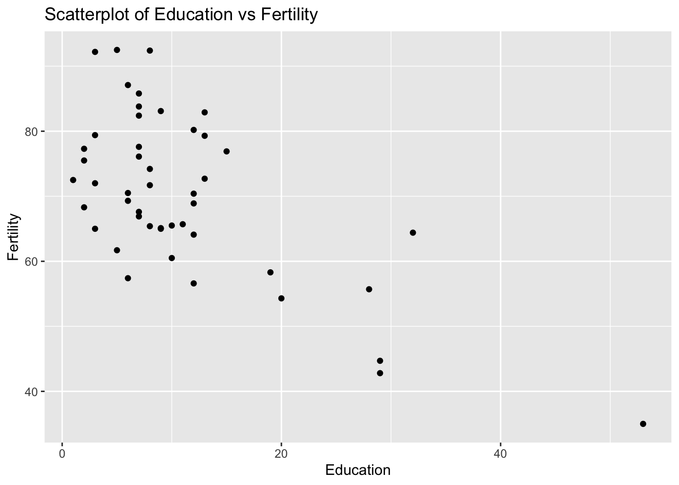 # Create scatterplotggplot(swiss, aes(x = Education, y = Fertility)) +geom_point() +labs(title ="Scatterplot of Education vs Fertility", x ="Education", y ="Fertility")