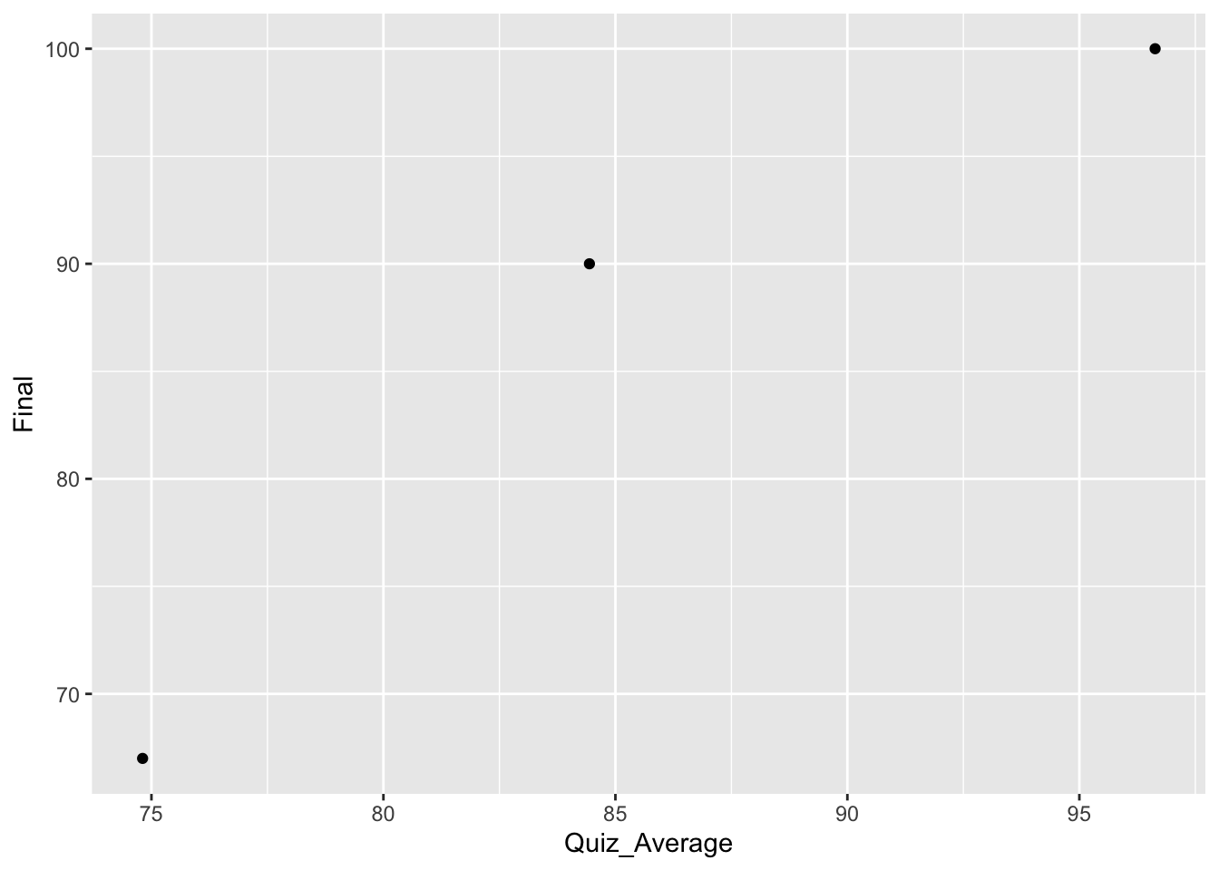 For the scatterplot, we would now plot these rows as points. Since the quiz average is the explanatory variable it will come first followed by the final score, the response variable: