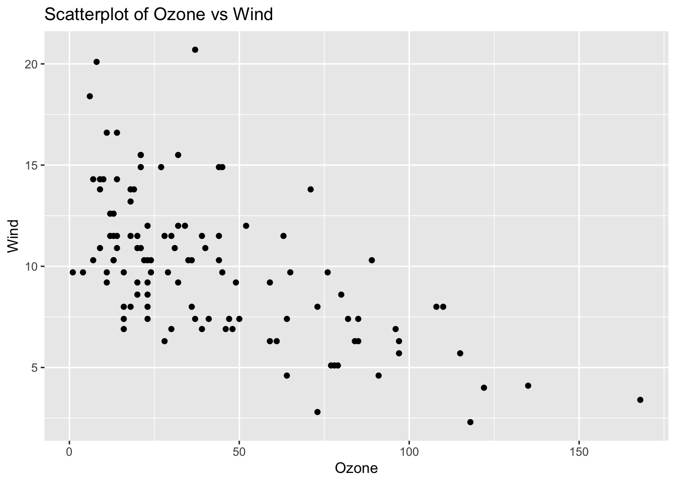 # Create scatterplotggplot(airquality_clean, aes(x = Ozone, y = Wind)) +geom_point() +labs(title ="Scatterplot of Ozone vs Wind", x ="Ozone", y ="Wind")