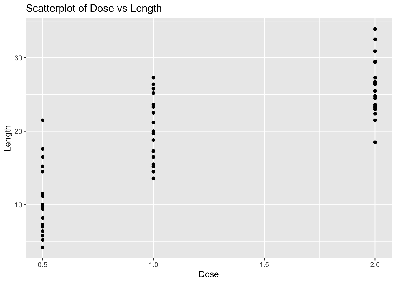 # Create scatterplotggplot(ToothGrowth, aes(x = dose, y = len)) +geom_point() +labs(title ="Scatterplot of Dose vs Length", x ="Dose", y ="Length")
