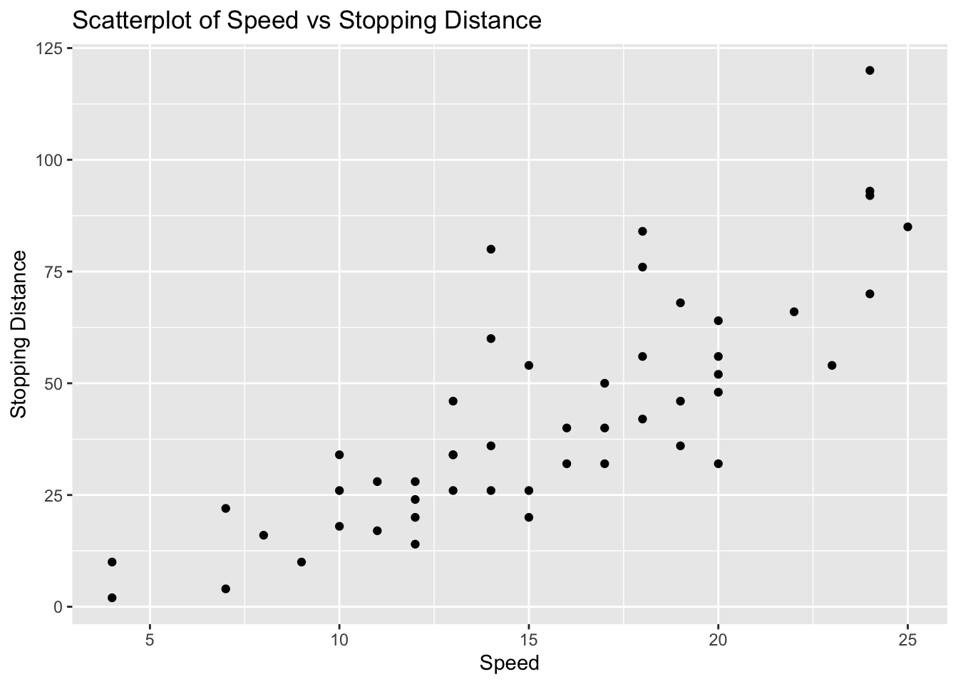 # Create scatterplotggplot(cars, aes(x = speed, y = dist)) +geom_point() +labs(title ="Scatterplot of Speed vs Stopping Distance", x ="Speed", y ="Stopping Distance")