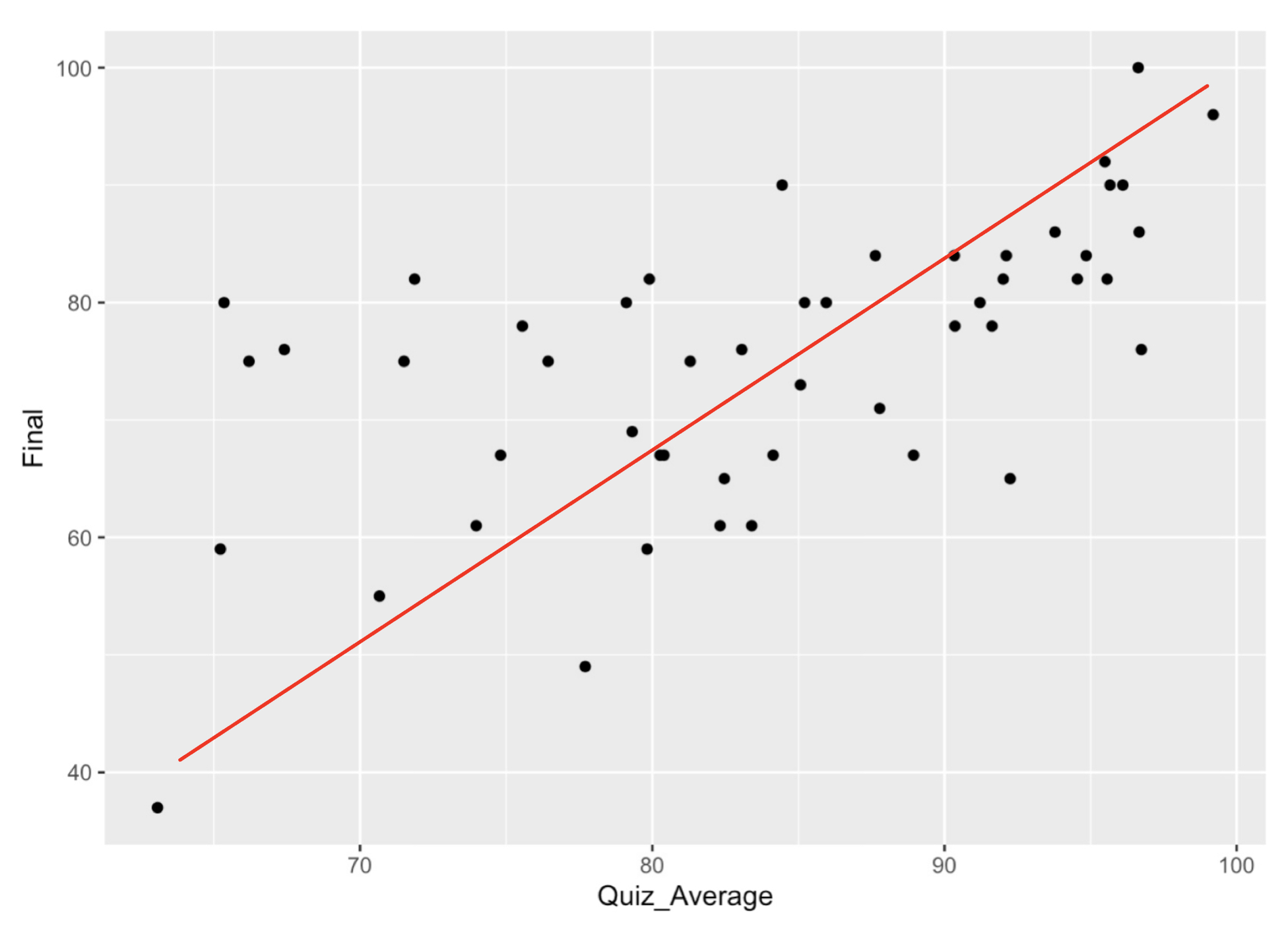 # Calculate the coorelation between the Quiz Average and grade on Finalr <-cor(grades$Quiz_Average, grades$Final)r