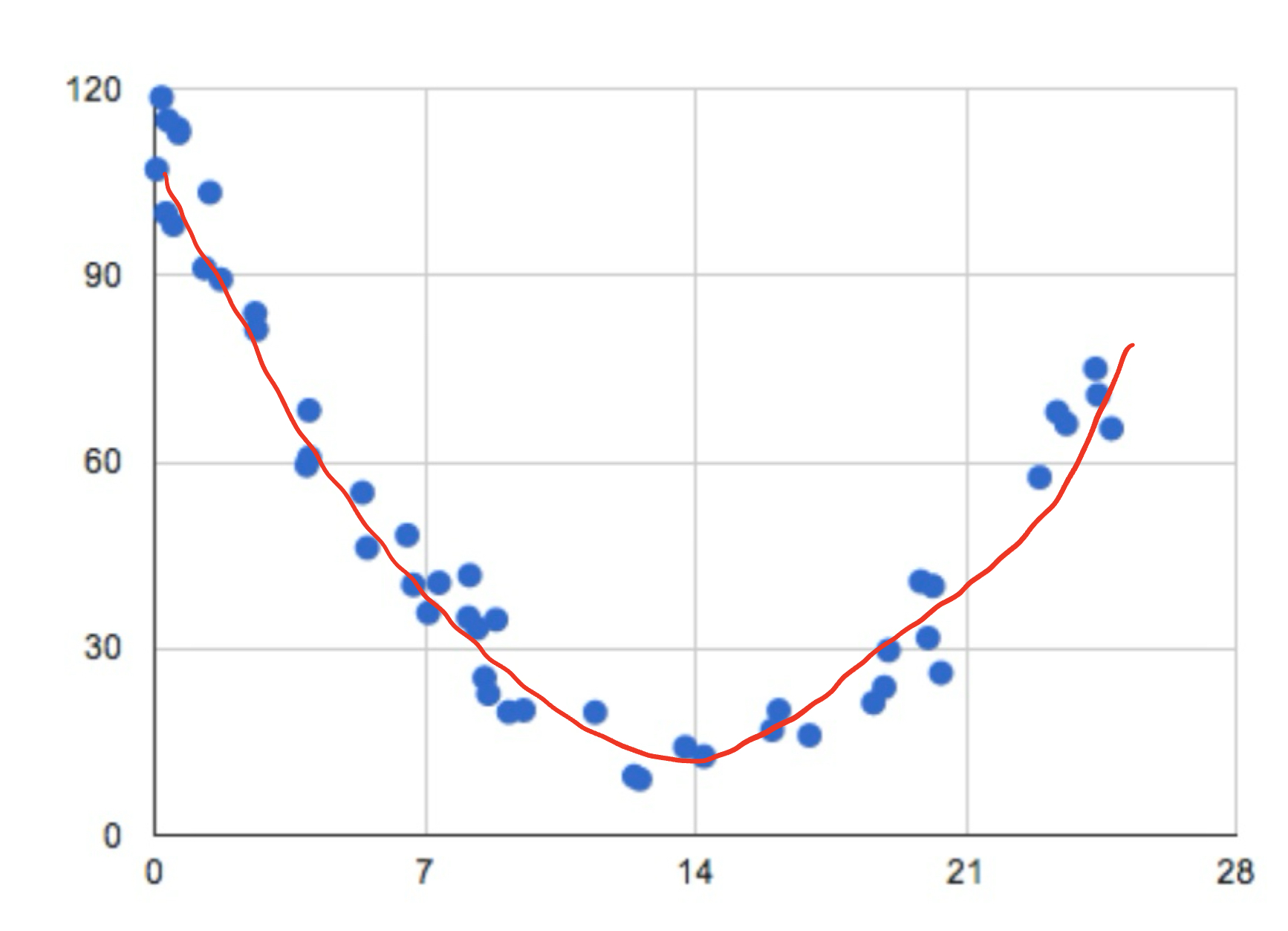 Form : The data clearly follows a pattern, but it is not a linear pattern. This means we will describe this form as non-linear.