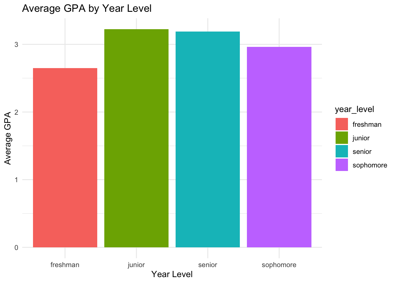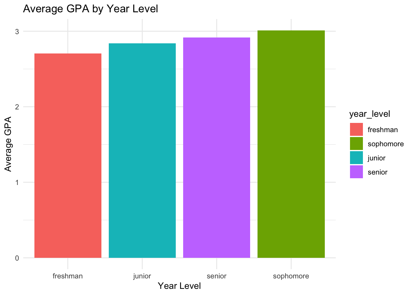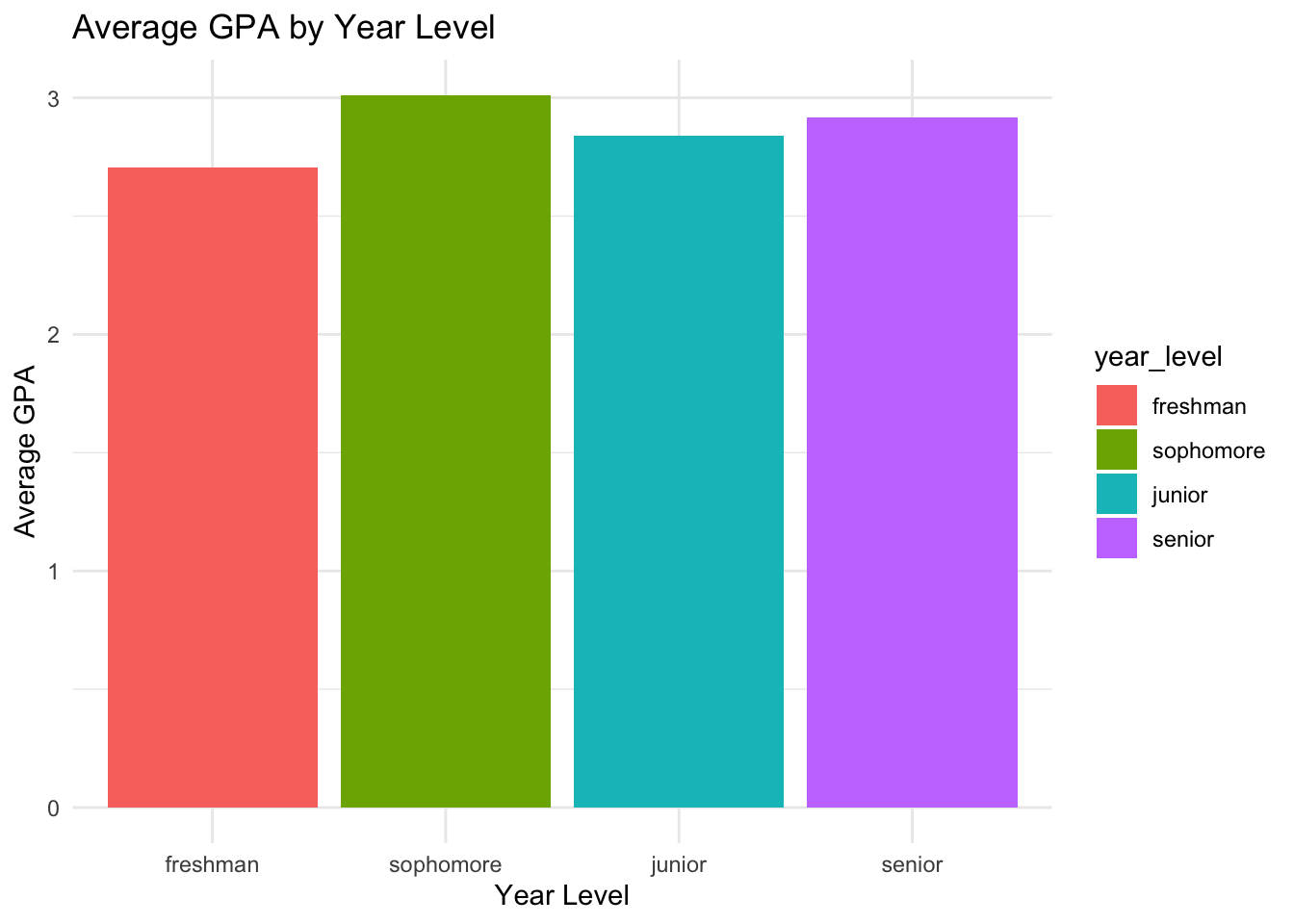 student_data |>group_by(year_level) |>summarise(avg_gpa =mean(gpa)) |>ggplot(aes(x = year_level, y = avg_gpa,fill = year_level)) +geom_col() +labs(title ="Average GPA by Year Level",x ="Year Level",y ="Average GPA") +theme_minimal()