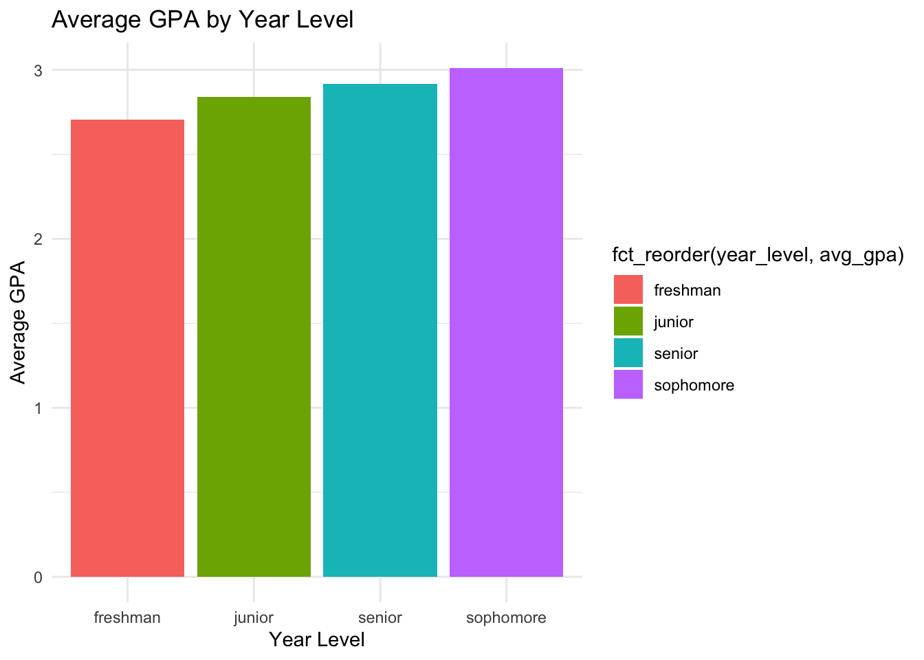 In this case, we want to reorder the year_level factor by the average GPA, so we need to calculate the average GPA for each year level first and then use that to reorder the factor.