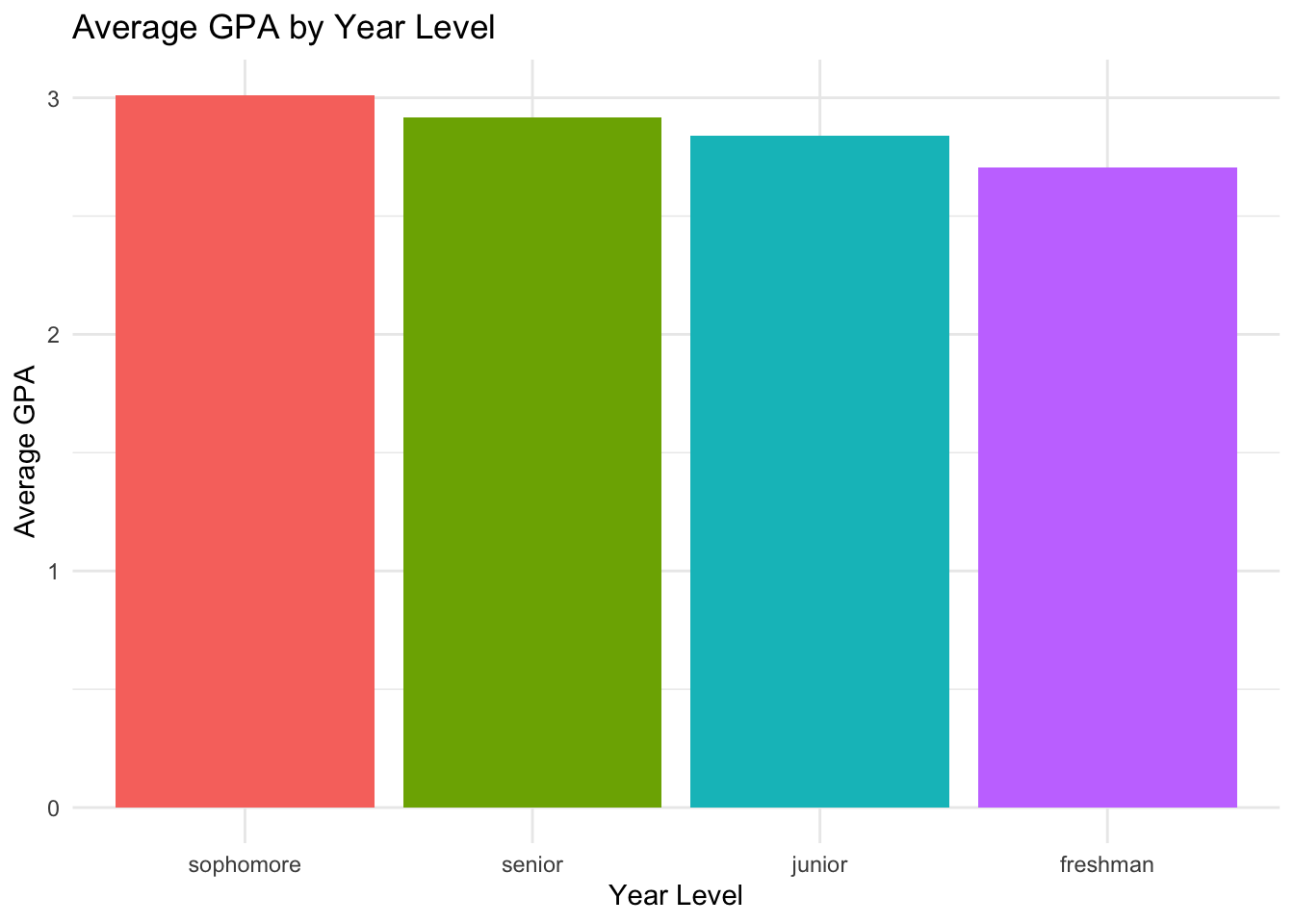 student_data |>group_by(year_level) |>summarise(avg_gpa =mean(gpa)) |>ggplot(aes(x =fct_reorder(year_level, avg_gpa, .desc =TRUE), y = avg_gpa,fill =fct_reorder(year_level, avg_gpa, .desc =TRUE))) +geom_col() +labs(title ="Average GPA by Year Level",x ="Year Level",y ="Average GPA") +theme_minimal() +theme(legend.position ="none")