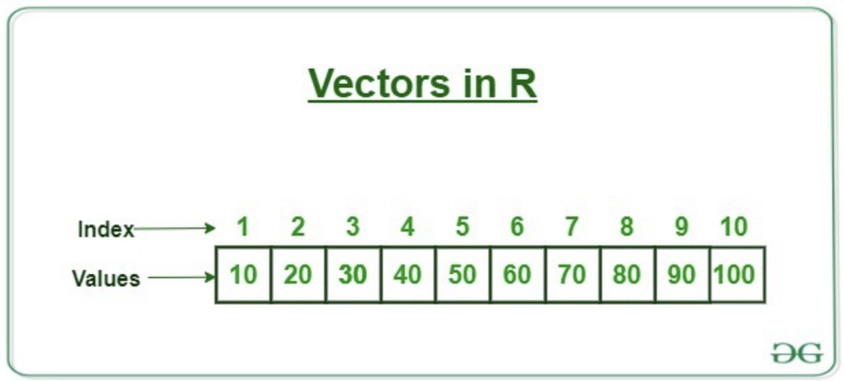 A vector is a 1-dimensional (row) structure that can hold multiple elements. For example, we can create a vector that contains 10 numbers such as this one :