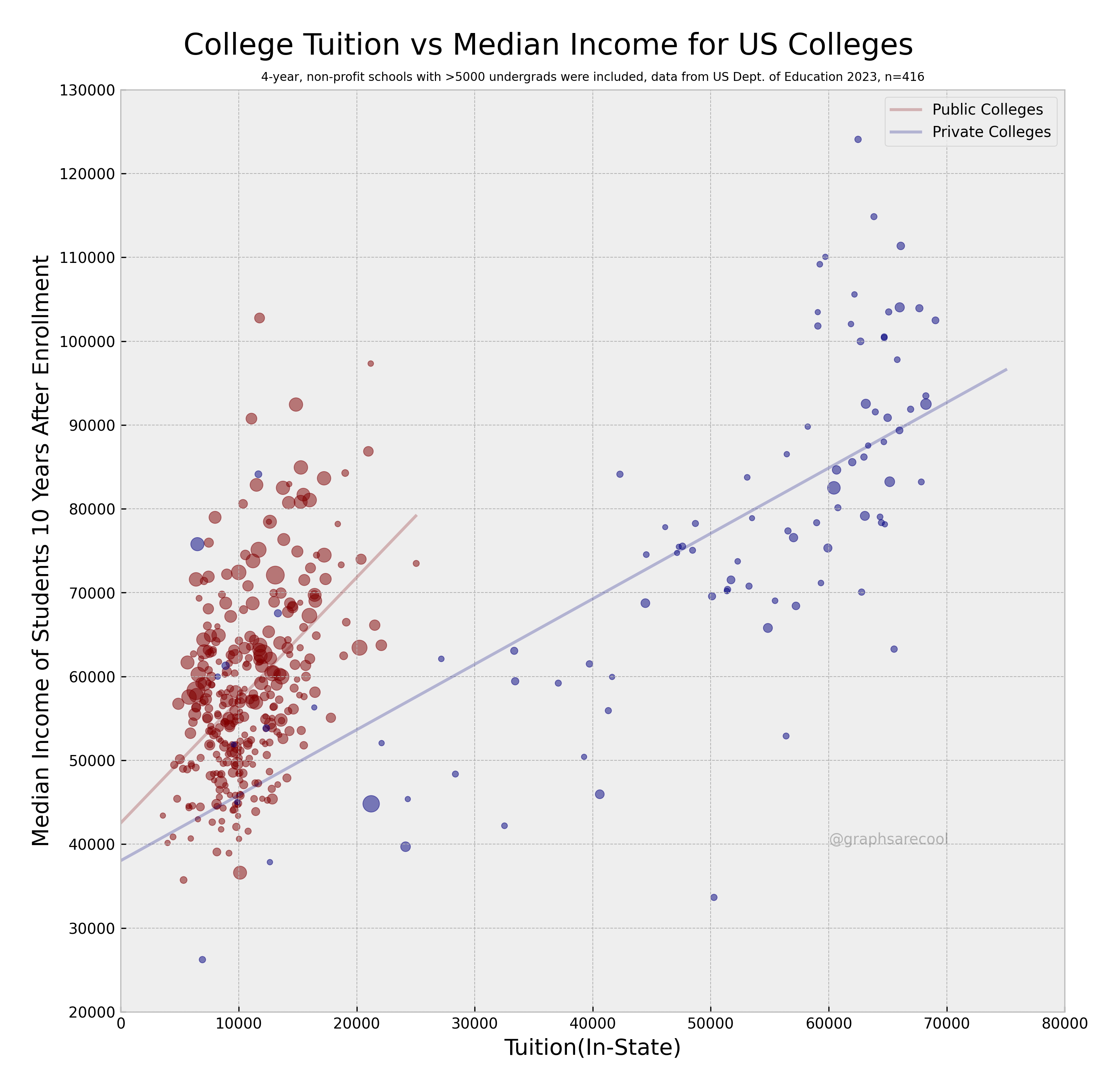 annotate("text", x = 65000, y = 128000, label = "Private Colleges (Blue)\nPublic Colleges (Red)", hjust = 0)