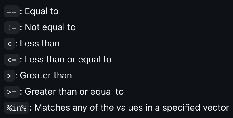 # Filter rows where value is in the set of 1, 5, or 10filtered_data_7 <-filter(data, value %in%c(1, 5, 10))filtered_data_7
