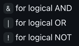 Lastly, we can use the filter() function to filter the data based on multiple conditions. You can specify multiple conditions by passing them as arguments to the filter() function. Here are the logical operators you can use to combine multiple conditions: